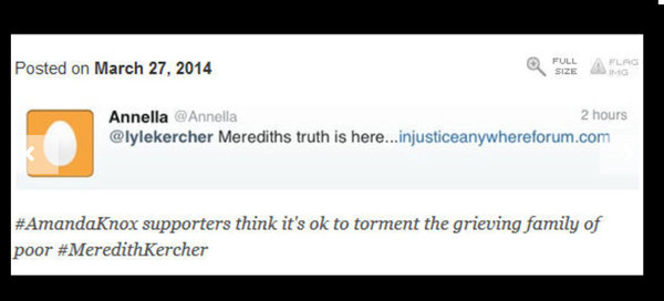 To make matters worse, Amanda Knox follows these trolls on twitter showing that she was aware of them and never spoke out against the abuse of the Kerchers or the personal attacks. On her own blog, she approved comments that insulted the murder victim’s family.