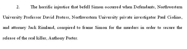 Anthony Porter could not be returned to prison due to the fact that he had been pardoned by the governor. In February 2015, Alstory Simon filed a $40 million lawsuit against Ciolino, Protess and Northwestern University.