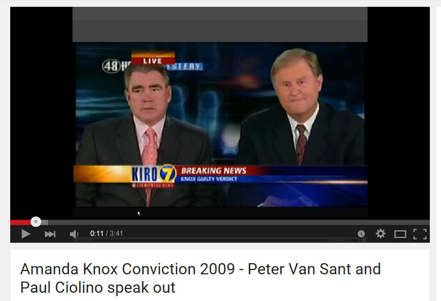 Immediately after Knox and Sollecito were convicted of the murder in 2009, Ciolino and van Sant were prominently displayed on American television where they gave impassioned seemingly rehearsed, monologues of their ‘expert’ opinions of the case. This is how a murder trial is presented to Americans?