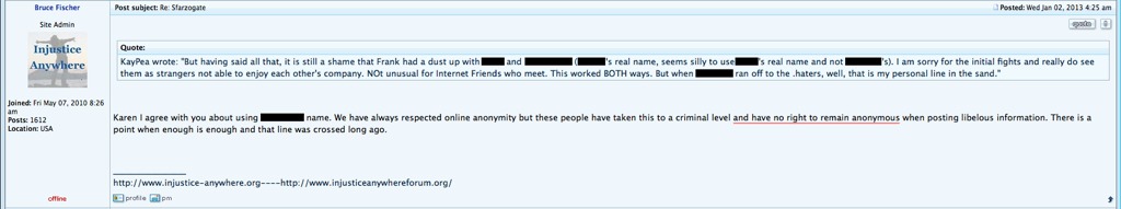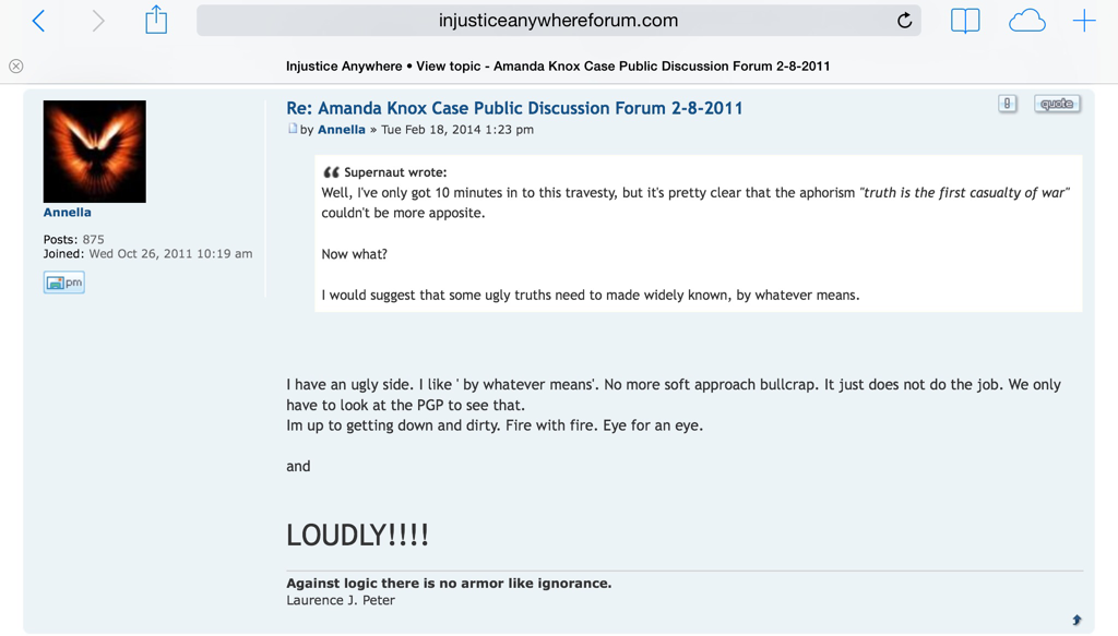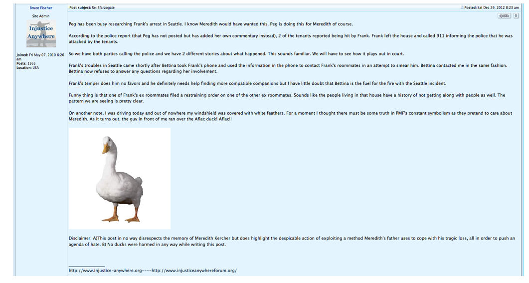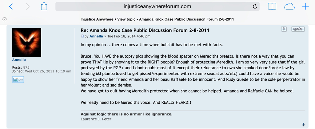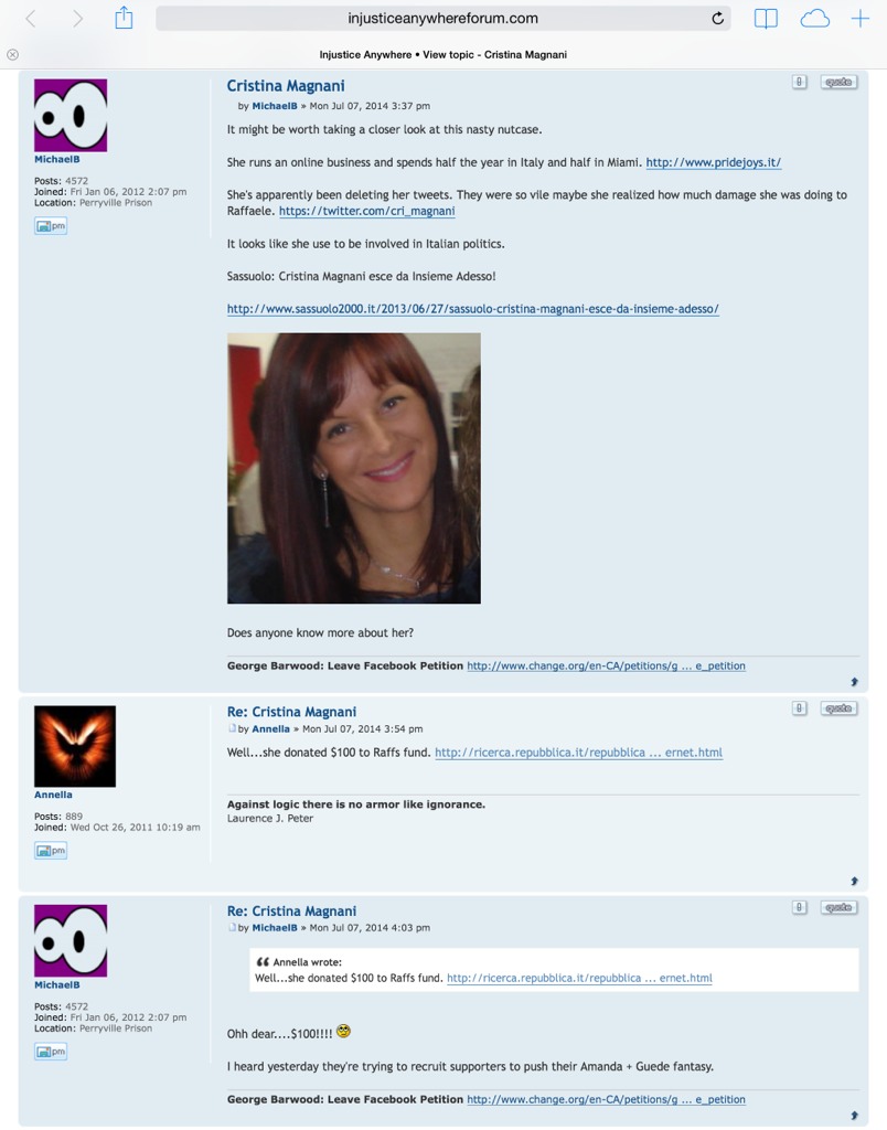 Paul Ciolino was connected to Bruce Fischer who describes himself as executive director of Injustice Anywhere website. This website and its forum has been a place where Amanda Knox supporters congregated. The many personal attacks online by this organization are too numerous to cover in one blog. However, below are some screen shots from IIP’s website illustrating how they chose to campaign for Amanda Knox including Annella whom Amanda Knox follows on twitter and Bruce Fischer ridiculing the feather symbol that Meredith’s dad wrote about in his book.