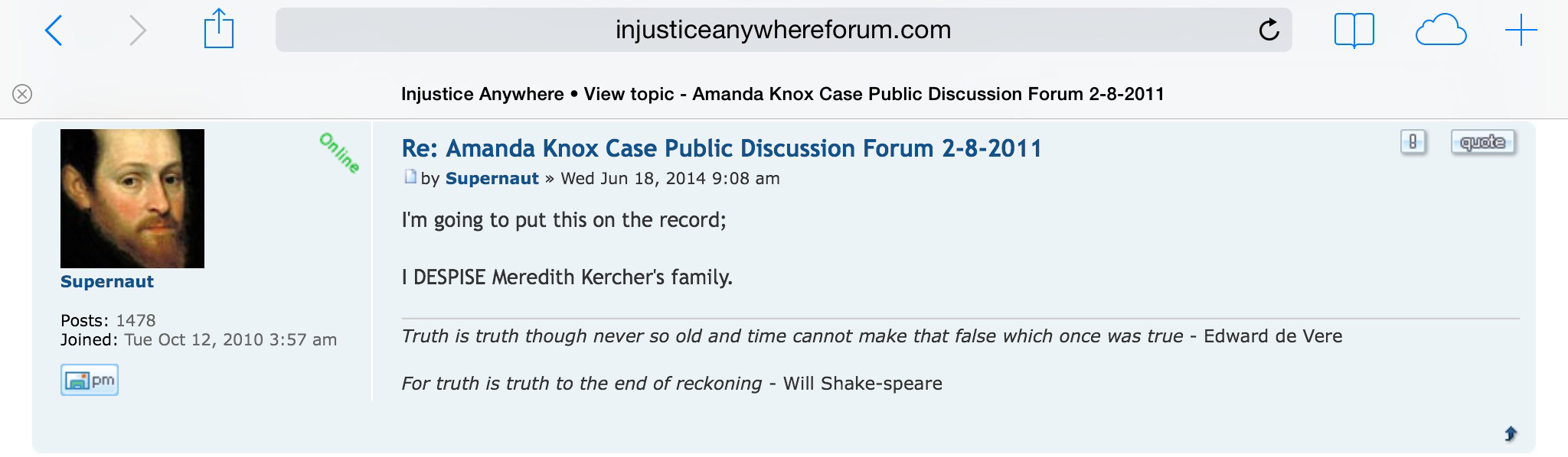 A troll that goes by the name Annella has contacted the murder victim’s family, employers of those she opposes and uses a photoshopped avatar portraying Amanda Knox as friends with Meredith Kercher even though many witnesses and the Kerchers maintain that they were not friends, hence no real pictures of them together exist. Annella also made many disturbing comments on Bruce Fischers IIP forum (see below).