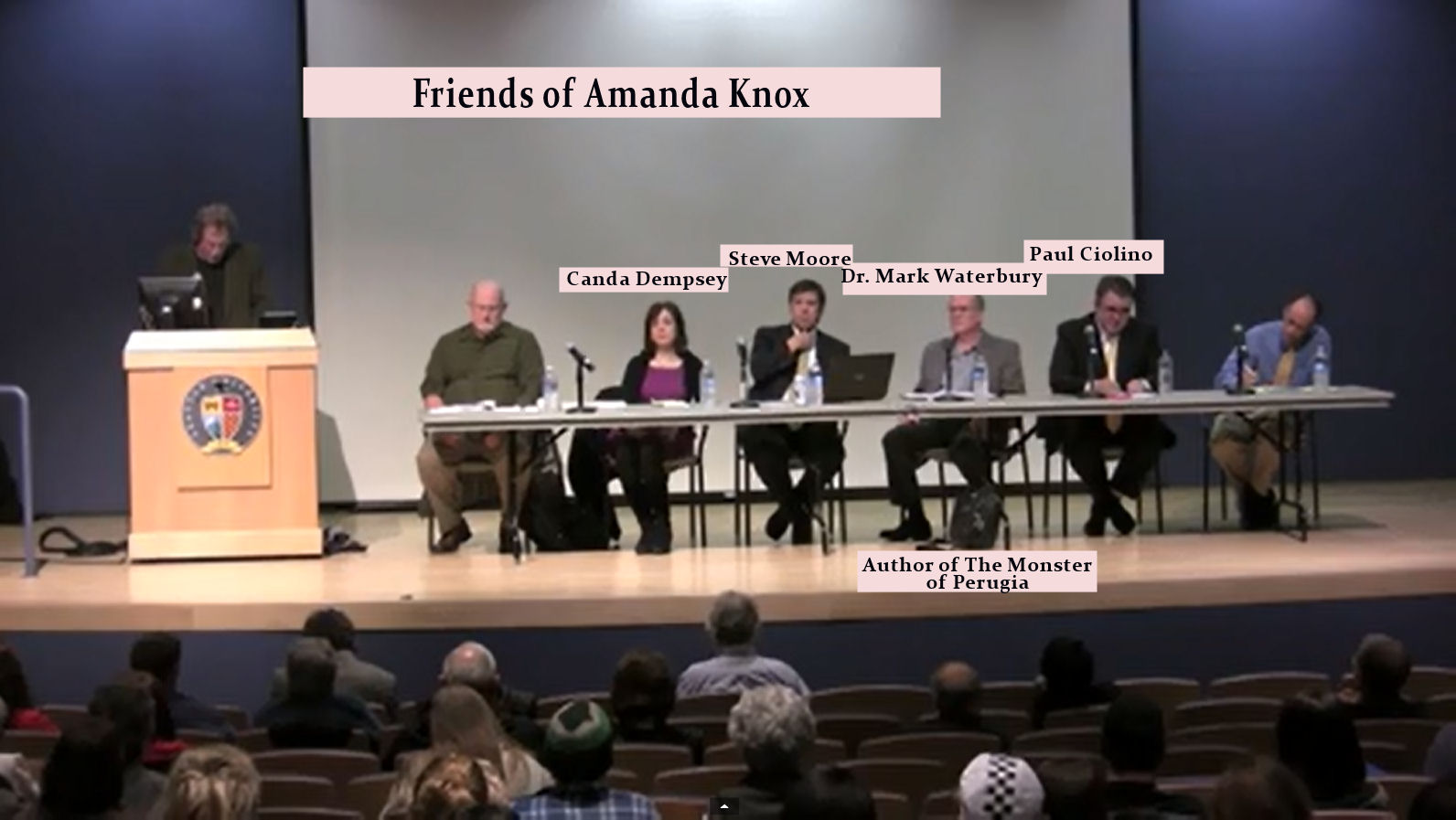 The individuals on the above panel: Candace Dempsey, Steve Moore and Mark Waterbury all wrote pro-Knox books about the murder of Meredith Kercher and profited handsomely from her death. No word of any proceeds being allocated to the Kercher family.