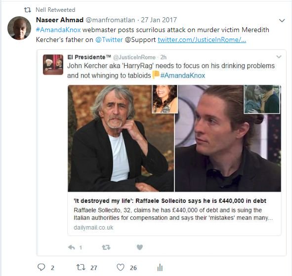 When trolls on Twitter attacked the victim’s family, again, Amanda never said a single word of reprobation. Why? Because she took a part in it. We know this because she followed the worst trolls of the lot on Twitter showing her full support for abusers of the victim’s family. Below is a small sample of the abuse that has transpired online over the past few years with Amanda Knox’s blessings as she rose to become a professional victim.